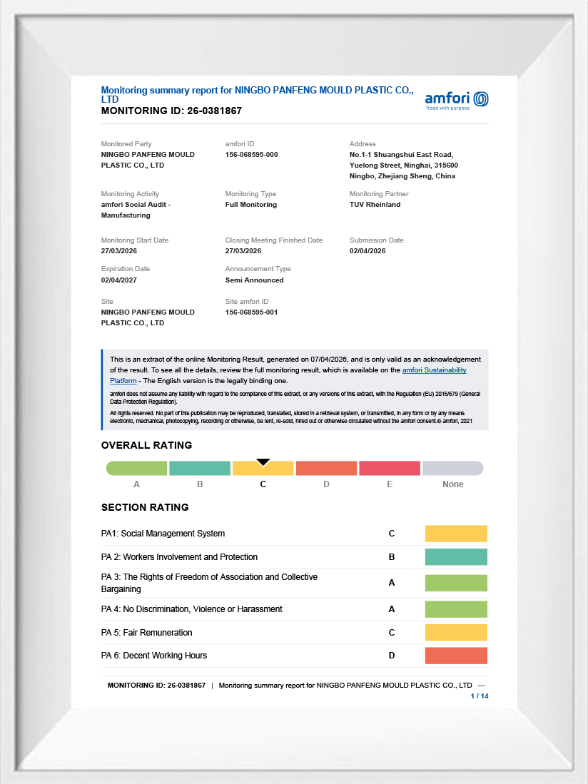 PanFeng hält in seinen Produktionsprozessen an hohen Qualitäts- und ethischen Werten fest. Zu diesem Zweck hat unser Unternehmen die Zertifizierungen BSCI (Business Social Responsibility Initiative) und ICS (Compliance and Sustainability Initiative) erhalten.