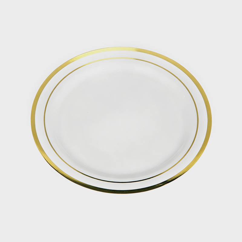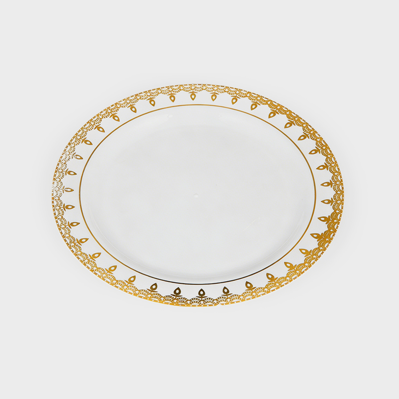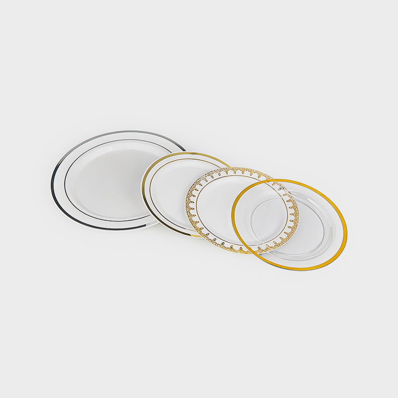 Einweg-Partyteller mit Spitzendesign ist ein hochwertiges Einweggeschirr, das Dekoration und Zweckmäßigkeit vereint. Im Gegensatz zu gewöhnlichen Einweg-Partytellern besticht er durch sein zartes Spitzenbild und besteht aus strapazierfähigem, lebensmittelechtem Material. Mit einem weißen Sockel mit goldenen Spitzenmustern verleiht es verschiedenen Veranstaltungen eine elegante dekorative Note. Es besteht aus BPA-freiem, ungiftigem, lebensmittelechtem Hochleistungskunststoff, ist robust und langlebig und kann heiße Speisen und Soßen aufnehmen, ohne zu zerbrechen. Der Einweg-Partyteller mit Spitzendesign kann einmal verwendet oder gewaschen und wiederverwendet werden und eignet sich daher für verschiedene formelle und informelle Anlässe. Seine Schönheit und Praktikabilität erfüllen perfekt die Geschirrbedürfnisse verschiedener Partyszenarien.